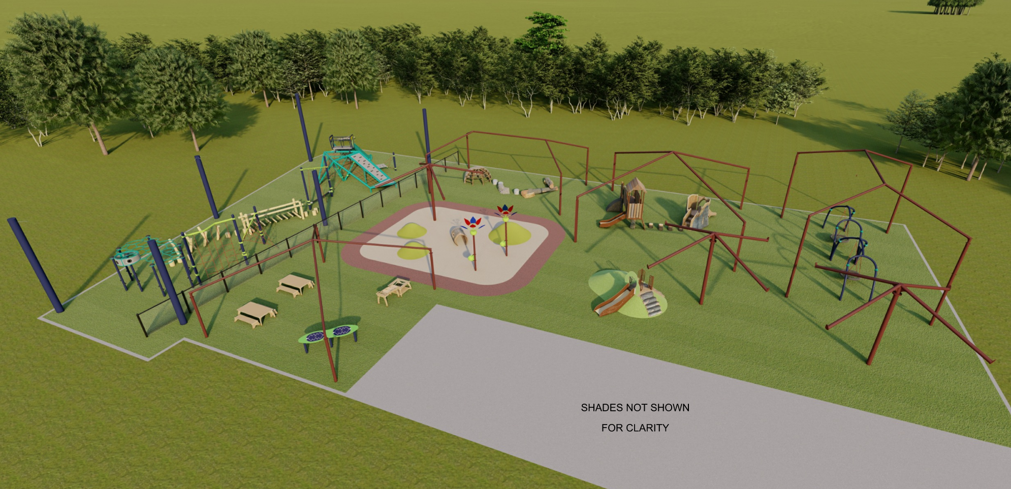 While some shade was included early on, additional coverage was introduced later in the process based on client input. Rather than simply adding structures, the goal was to integrate shade in a way that enhances the overall environment.